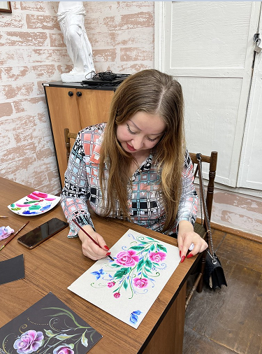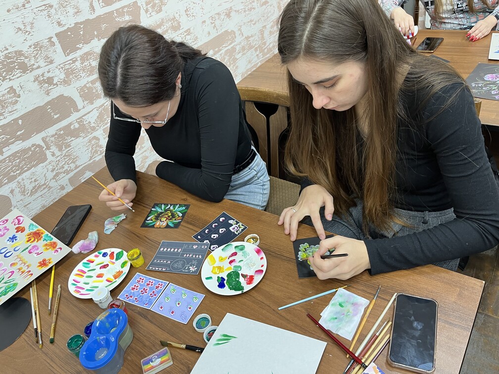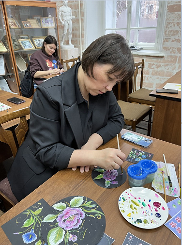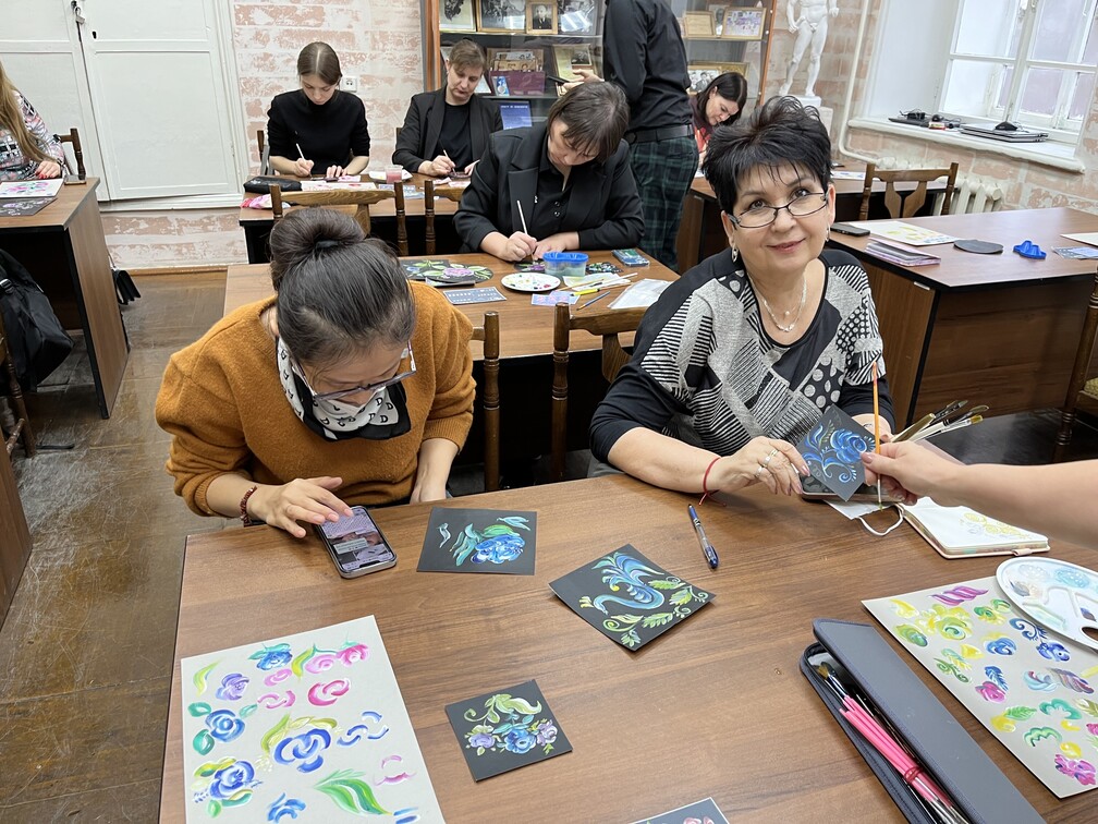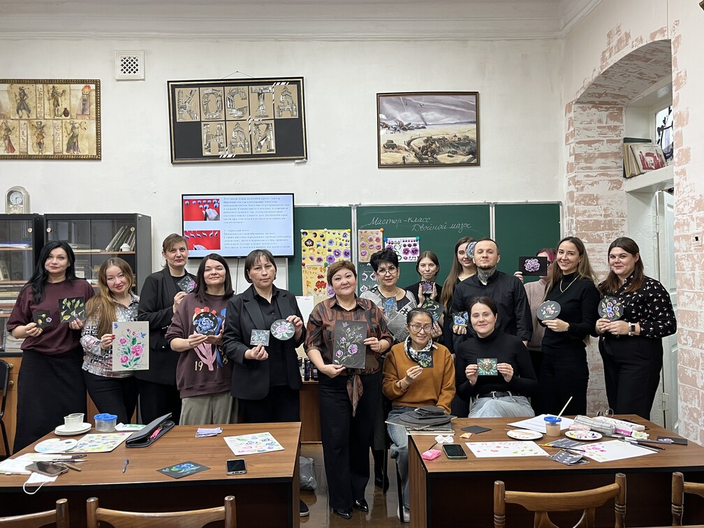 В ходе занятия педагогам были представлены основные приёмы и технические особенности выполнения двойного мазка - методики, позволяющей сочетать два цвета на одной кисти и создавать выразительные декоративные элементы. Участники познакомились с этапами подготовки рабочей поверхности, подбором материалов и выполнением базовых элементов, после чего смогли применить полученные знания на практике, создавая собственные небольшие композиции.